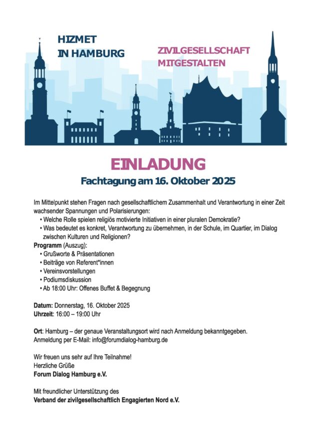 Tagung: Hizmet in Hamburg- Zivilgesellschaft mitgestalten Fachtagung am 16. Oktober 2025 wir laden Sie herzlich ein zur Fachtagung „Hizmet in Hamburg – Zivilgesellschaft mitgestalten“. Im Mittelpunkt stehen Fragen nach gesellschaftlichem Zusammenhalt und Verantwortung in einer Zeit wachsender Spannungen und Polarisierungen: • Welche Rolle spielen religiös motivierte Initiativen in einer pluralen Demokratie? • Was bedeutet es…